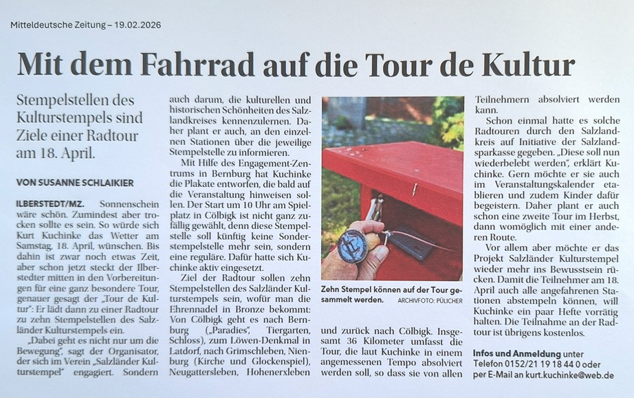 das Wetter lockt und die Radsaison geht wieder los. Wir freuen uns, dass ihr Interesse am Salzländer Kulturstempel immer noch so groß ist und viele Kulturinteressierte unsere Stempelstellen entdecken.